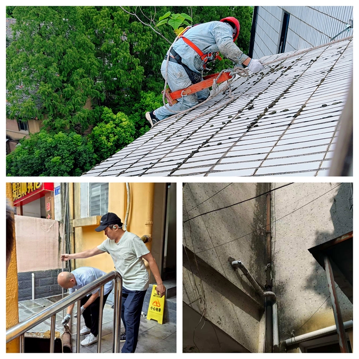 8月安全巡查期間,綜合服務(wù)中心安全科針對(duì)紡織南路7號(hào)樓及周邊區(qū)域開(kāi)展專項(xiàng)隱患排查,發(fā)現(xiàn)兩處亟待處理的安全問(wèn)題:一是7號(hào)樓公廁外側(cè)落水管多處破裂,導(dǎo)致雨水滲漏至路面并形成大面積積水,不僅影響市容環(huán)境,更對(duì)過(guò)往車輛及行人構(gòu)成潛在風(fēng)險(xiǎn);二是慶達(dá)綜合樓頂層臨街面瓷磚多處開(kāi)裂,縫隙中滋生的灌木根系已侵入建筑結(jié)構(gòu),存在高空墜物隱患,嚴(yán)重威脅公共安全。