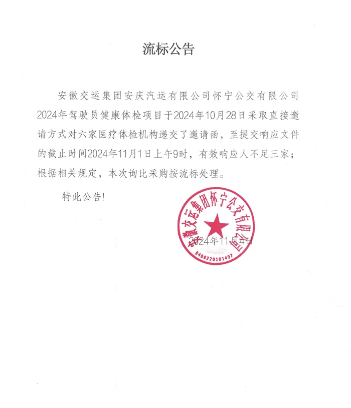 懷寧公交公司2024年駕駛員健康體檢項(xiàng)目流標(biāo)公告