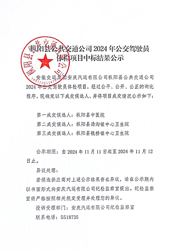樅陽(yáng)公交駕駛員2024年體檢項(xiàng)目中標(biāo)公告